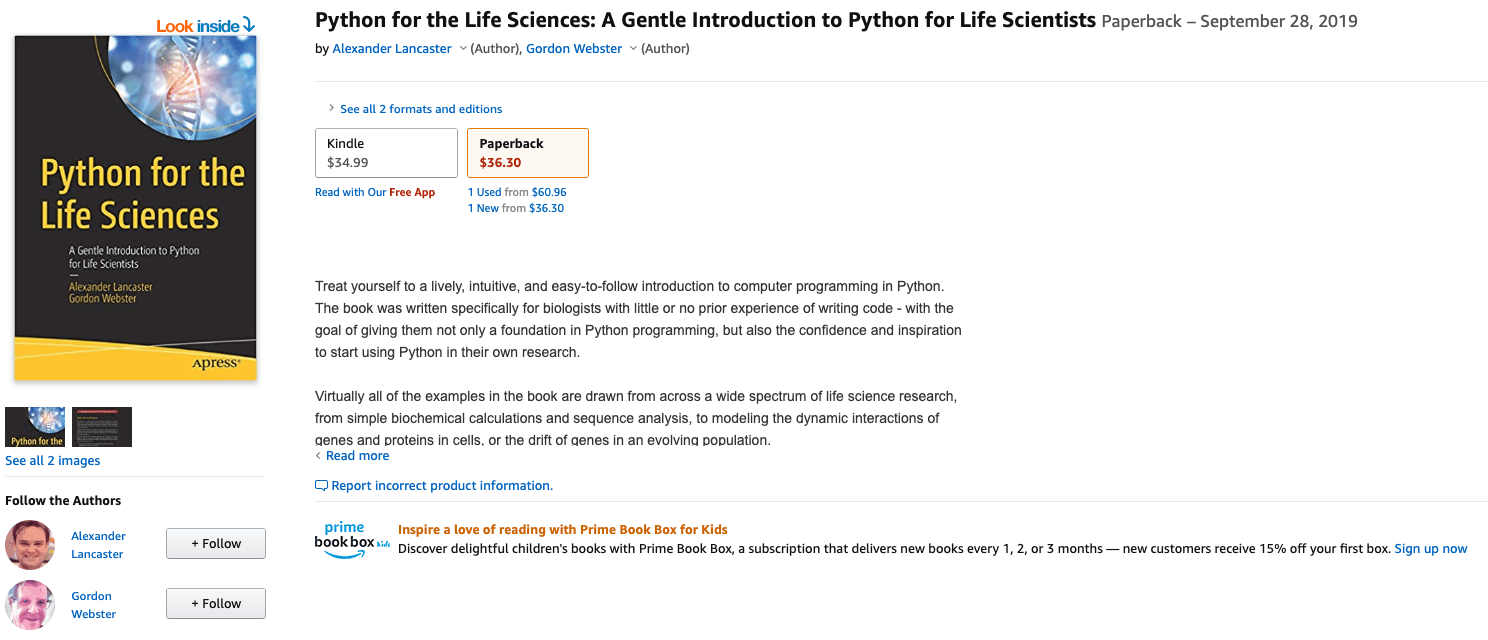 It’s official – Python for the Life Sciences is available for purchase as of September 28th, 2019. You can now pick up your eBook or softcover copy at Amazon!